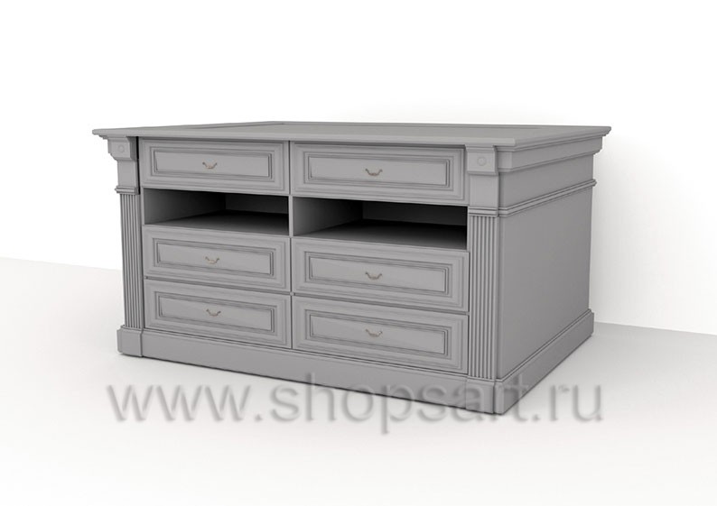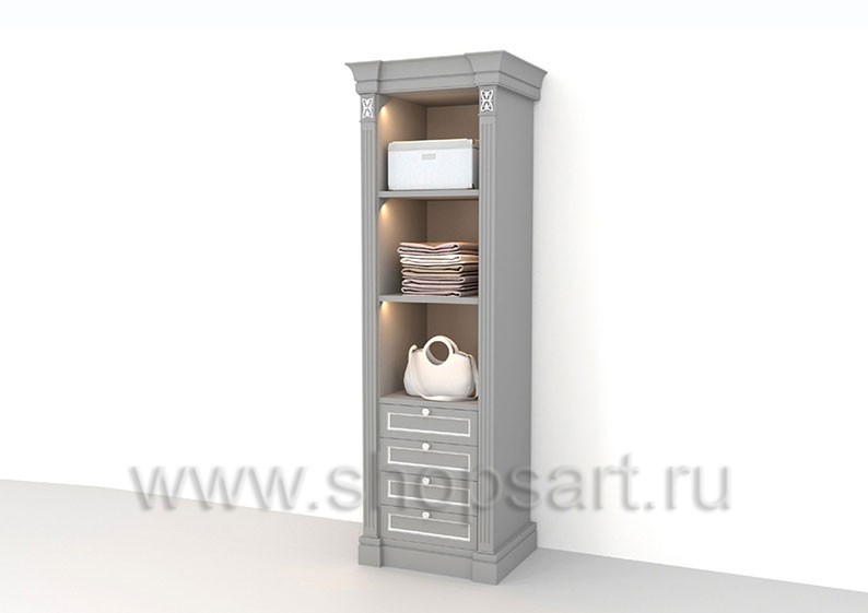 Пристенный шкаф предназначен для оформления и хранения вещей в гардеробной комнате, имеет открытую конструкцию с полочками. В нижней части изделия установлена тумба с выдвижными ящиками. Изделие выполнено из матового ЛДСП, цвет светло серый. Шкаф для белья оформлен в классическом стиле, декоративная отделка колонны, карниз и цоколь изделия выполнены из массива дуба. Шкаф может быть выполнен в другом цвете материалов по желанию заказчика.