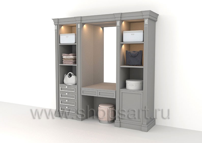 Открытый гарнитур с туалетным столиком предназначен для размещения косметики или аксессуаров. В нише установлено зеркало, в котором можно любоваться своим отражением собираясь на прогулку или работу. Для удобного размещения перед туалетным столиком предусмотрено место для банкетки или пуфика. Конструкция гарнитура оформлена в классическом стиле. Гарнитур может быть выполнен в другом цвете материалов.