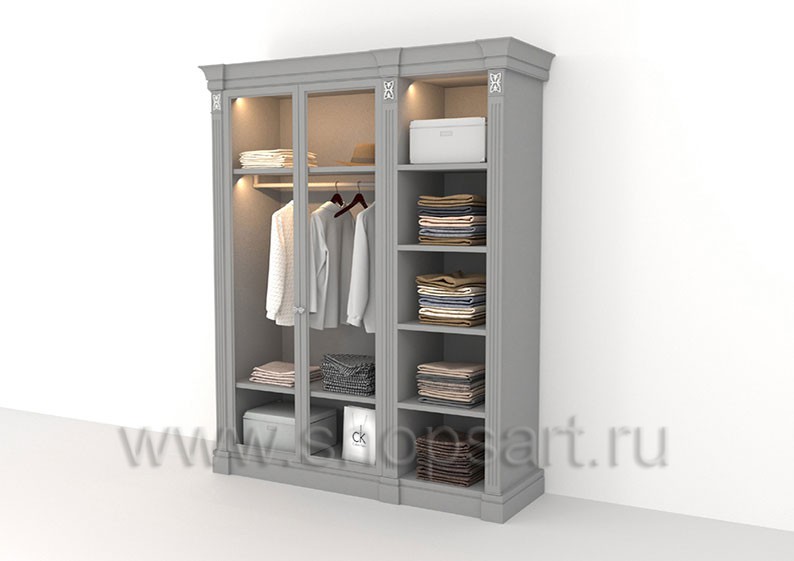 Мебель для гардеробной комнаты в виде двухсекционного шкафа для одежды и личных вещей оформлена в классическом стиле. Первая секция шкафа состоит из открытой пристенной конструкции с полками для хранения одежды, оснащена тумбой с выдвижными ящиками для хранения личных вещей. Вторая секция изделия состоит из шкафа для одежды с распашными стеклянными дверками, оснащена навесной штангой для одежды и полочками для выкладки вещей.