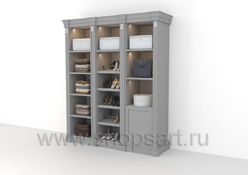 Открытый модуль для гардеробной комнаты, состоит из трех секций шкафов, оформлен в классическом стиле. Первая секция состоит из шкафа с прямыми полками для хранения одежды или белья. Вторая секция имеет конструкцию с наклонными полками для хранения обуви. Третья секция состоит из прямых полочек и тумбы с распашной дверкой для удобного размещения личных вещей. Конструкция модуля выполнена из матового, ЛДСП серого цвета с декоративными элементами из массива дуба.