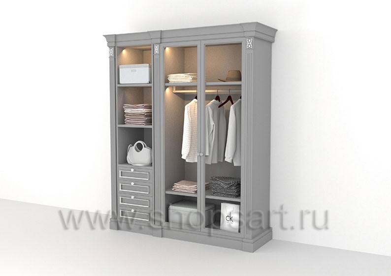 Шкаф для гардеробной комнаты представлен в классическом стиле, состоит из двух секций. Первая секция изделия состоит из открытой пристенной конструкции с полками для хранения одежды. Вторая секция изделия состоит из шкафа для одежды с распашными стеклянными дверками и четырех выдвижных ящиков для хранения белья. Изделие выполнено из матового ЛДСП, цвет светло серый с декоративной отделкой из массива дуба.
