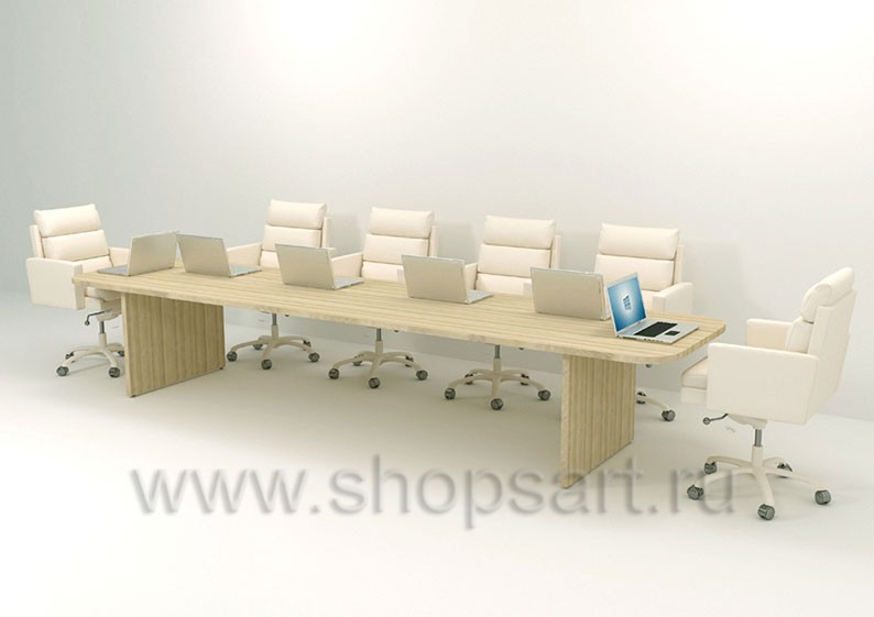 Стол для конференций «Дипломат» предназначен для оформления кабинета руководителя, приемных комнат или кабинета для переговоров в офисах или любых других учреждений. Прекрасный дизайн, плавные линии, мягкий цвет изделия – все это свидетельствует о серьезности, надежности и уверенности в своих силах руководителя компании. Стол для совещаний рассчитан на восемь, десять посадочных мест. Стол выполнен из матового ЛДСП, цвет «Акация светлая».