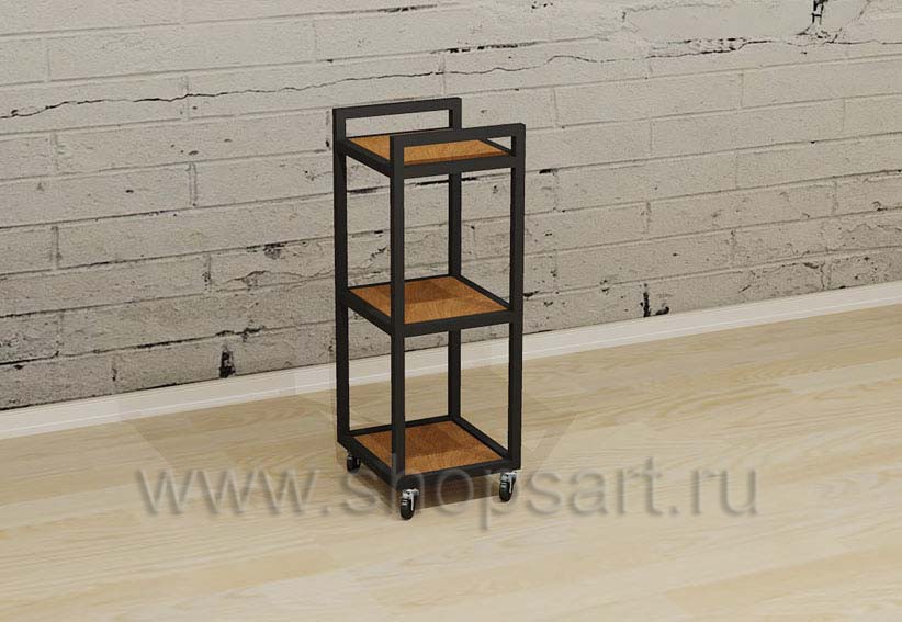 Мебель для барбершопа в виде тележки на металлическом каркасе и высоких ножках с колесиками. Тележка используется в салонах красоты оформленным в стиле Лофт, легко передвигается по залу, имеет 4 выдвижных ящика.