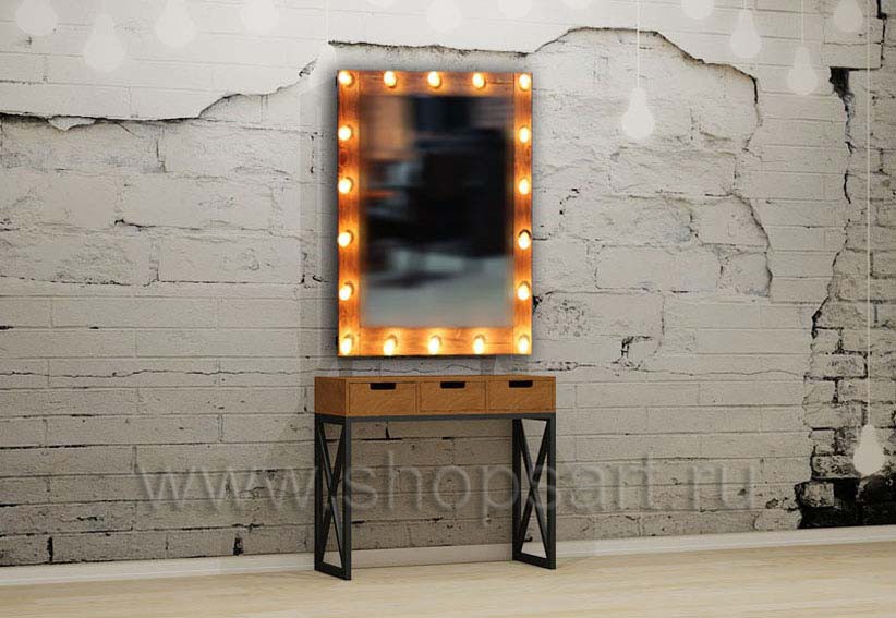 Комплект мебели для рабочего места визажиста выполнен в стиле Лофт. Зеркало изготовлено из МАССИВА ДЕРЕВА или ЛДП, крепится на стену. В зеркало устанавливается передняя подсветка. Столик на основе металлического каркаса содержит выдвижные ящики.