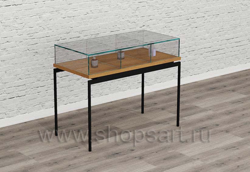 Островной столик для товара выполнен из металлического каркаса со столешницей из массива дерева и стеклянного колпака. Предназначен для выкладки и продажи товара.