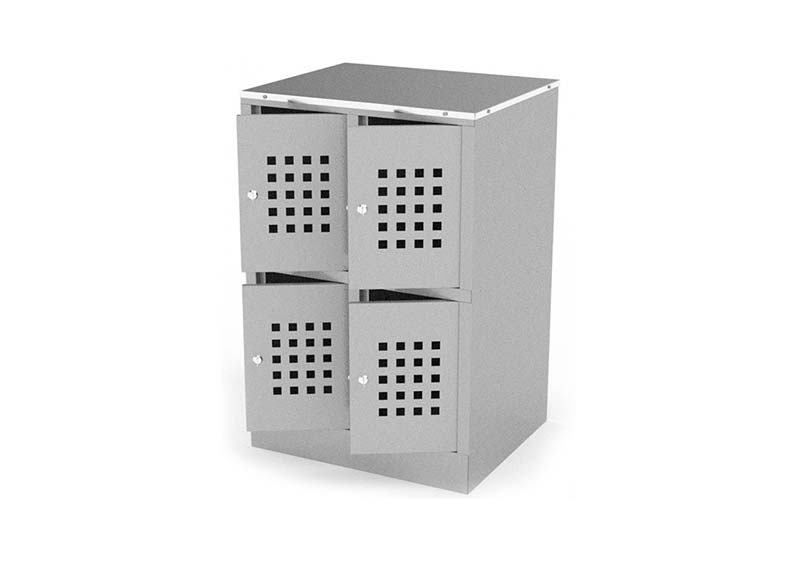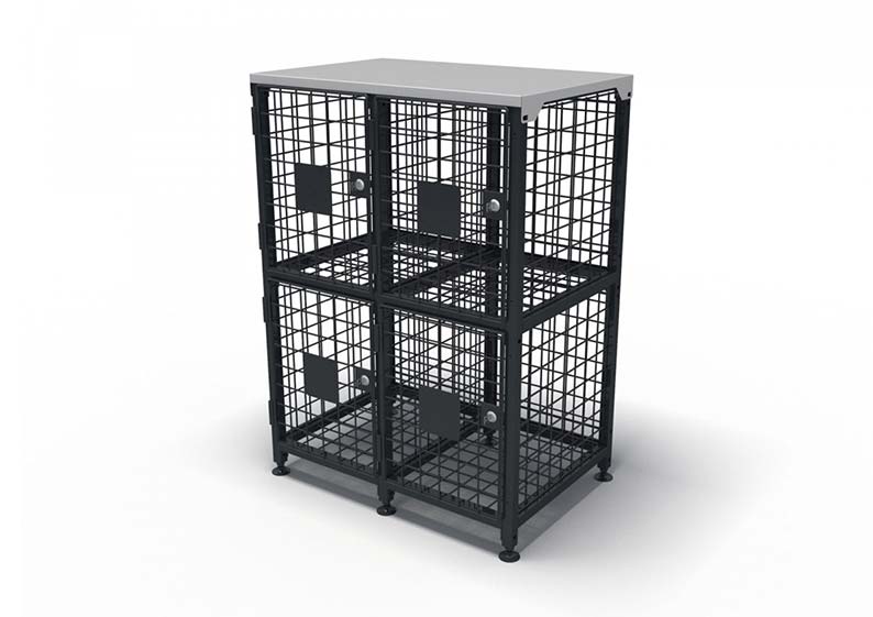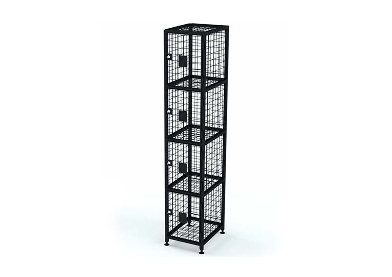 Металлический шкаф для сумок, сетчатой конструкции предназначен для хранения сумок и личных вещей покупателей в магазинах и супермаркетах. Конструкция содержит 4 ячейки и регулируемые ножки. Шкаф оснащен замками.