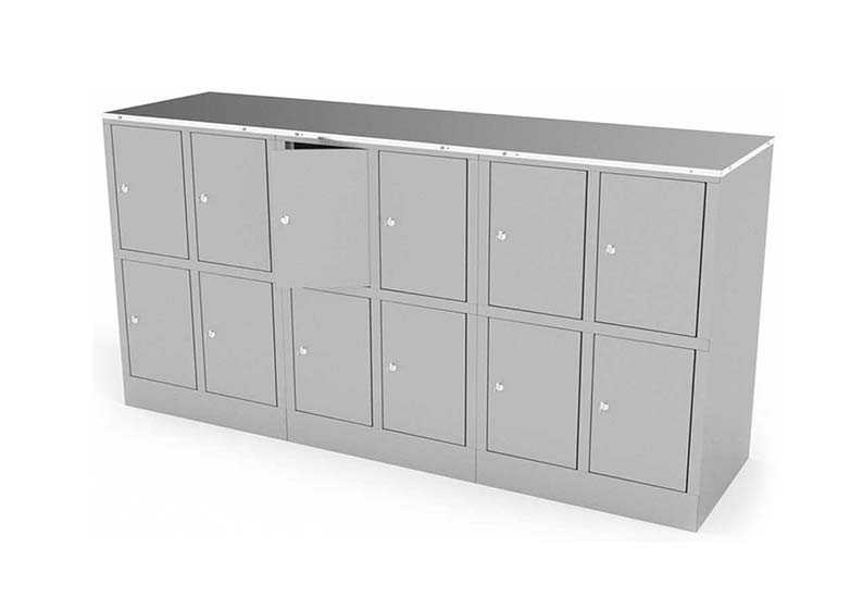 Сумочный шкаф со столешницей из нержавейки которую можно использовать в качестве рабочей поверхности для покупательских корзин или установки контрольных весов.