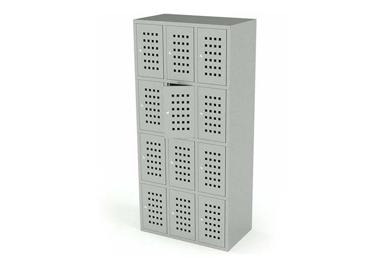 Металлический вертикальный шкаф для сумок предназначен для хранения личных вещей покупателей в магазинах. Сварная конструкция выполнена из 12 отделов с перфорированными дверками, замками и ключами.