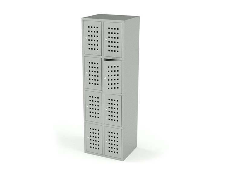 Металлический шкаф для хранения сумок имеет вертикальную долговечную сварную конструкцию. Выполнен из 8 отделов с перфорированными. По желанию заказчика может быть окрашен в любой цвет или комбинацию цветов по палитре RAL.