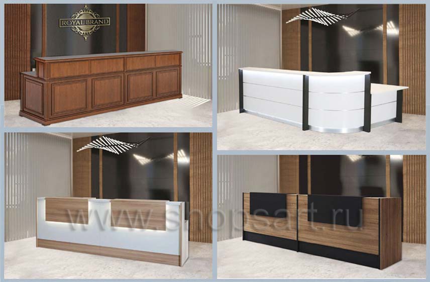 Технологии и дизайнерские решения, применяемые сегодня при изготовлении стоек регистрации, настолько разнообразны, что позволяют реализовать самые оригинальные идеи. Но самыми востребованными являются следующие типы стоек ресепшн по форме: