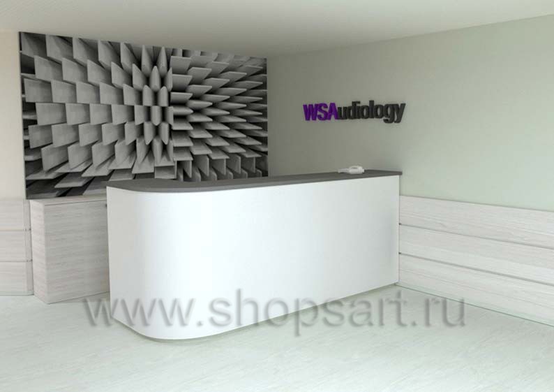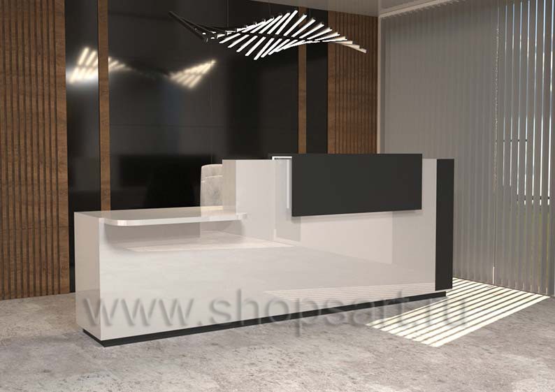 Ресепшен «Стаил» — угловая радиусная стойка, которая идеальна для помещений разного размера. Изготавливается из МДФ окрашенного в белый цвет с покрытием матовым лаком. Для контраста столешница ресепшена выполнена из серого матового ЛДСП. Возможно исполнение в другой цветовой гамме. Внутреннее наполнение – конструируется и исполняется по желанию заказчика.