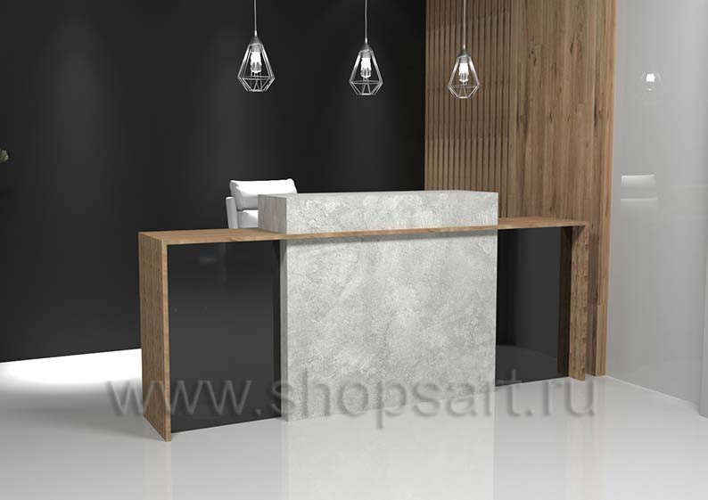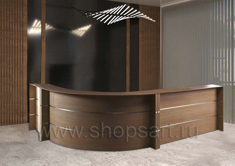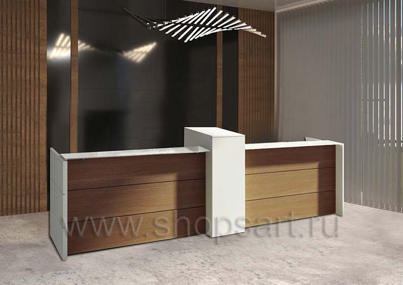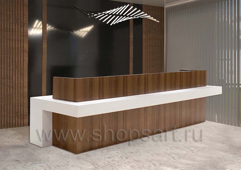 Стойка регистрации предназначена для оформления холлов деловых центров, медицинских центров, офисов, гостиниц. Служит рабочим местом для нескольких сотрудников. Фасадная часть стойки изготавливается из матового ЛДСП древесного цвета. По периметру декорируется массивной накладкой (полкой) из ЛДСП белого матового цвета. Материалы и габариты изменяются под нужды заказчика.