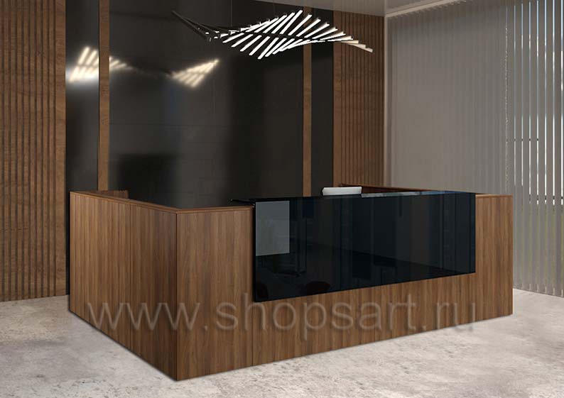 Ресепшн для администратора разработан для офисов, приемных администрации и прочих учреждений. Выполнен на два рабочих места. Изготавливается из матового древесного ЛДСП. Декоративные накладки и цоколь изготавливаются в черном, матовом цвете. Ресепшен может быть изготовлен в любой цветовой гамме.