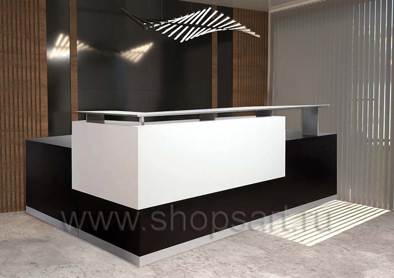 Угловой ресепшен «Статус» предназначен для офисов, банков и представительств с современным строгим стилем. Выполнен из ЛДСП черного и белого матового цвета, цоколь отделан металлизированным пластиком серебряного цвета. Гостевая столешница изготавливается из ЛДСП белого матового цвета, устанавливается на дистанционных крепежах.