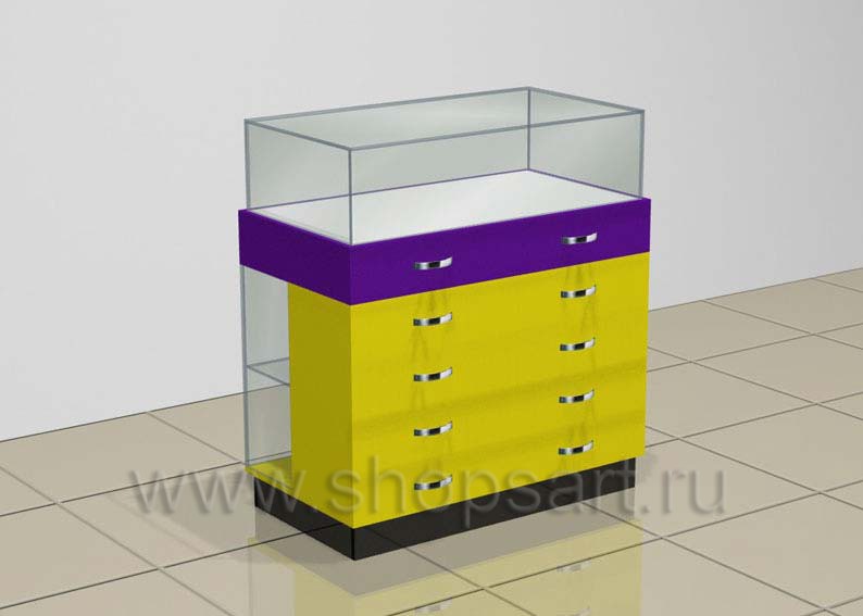 Прилавок изготовлен из комбинированных цветовых материалов. Верхняя часть прилавка выполнена в виде стеклянного колпака. Передняя часть выполнена в виде витрины со стеклянной полкой. С задней стороны прилавка имеются выдвижные ящики, которые служат накопителями для бижутерии или ювелирных украшений. Прилавок торговый может быть установлен как в линии прилавков, так и в центре зала. Прилавок витрина имеет максимальное поле для выкладки товара на разных уровнях. Все зоны закрываются на ключ.