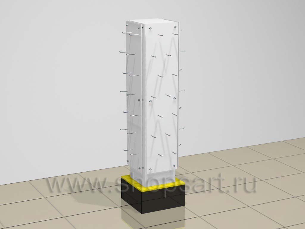 Торговая стойка предназначена для демонстрации бижутерии. Островная стойка имеет основание в виде колонны из ЛДСП к которой на дистанционных держателях, с четырех сторон, крепятся пластиковые панели из глянцевого молочного оргстекла с горизонтальной перфорацией. На панели устанавливаются прозрачные крючки из оргстекла для навески бижутерии. Внизу торговой стойки расположен подиум.