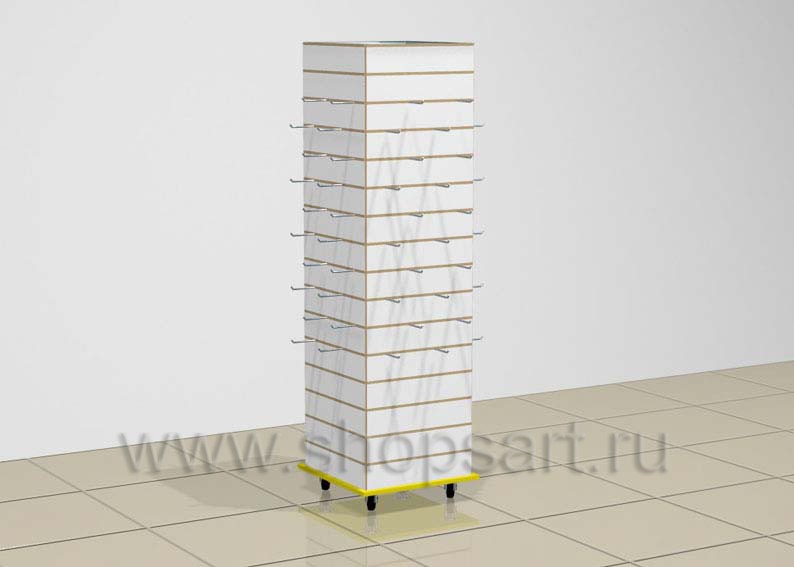 Торговая стойка предназначена для навески товара. Островная стойка имеет основание в виде колонны из ЛДСП и экономпанелей, расположенных с четырех сторон. Внизу торговой стойки расположен подиум. На экономпанель могут устанавливаться крючки или сферические чаши для мелкого товара. Цоколь подиумов можно изготовить из металлизированного пластика.