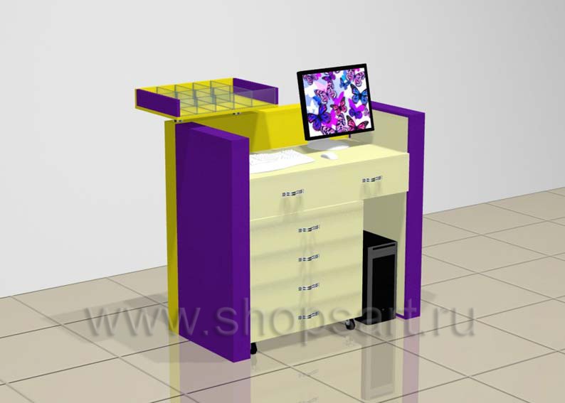 Кассовый стол изготовлен из комбинированных цветовых материалов, фасад выполнен в сиреневом цвете. Кассовый узел может иметь любое внутреннее наполнение: полки, дверки и шкафчики с ящиками на направляющих полного выдвижения. На верхнюю столешницу устанавливаются полеты для мелких изделий: колечек, заколок, серёжек.