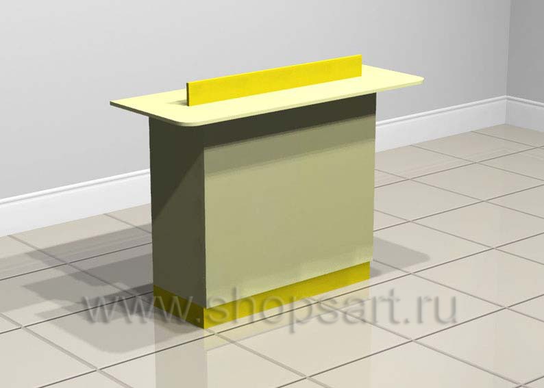 Кассовый стол изготовлен из комбинированных цветовых материалов. Внутренняя часть кассового стола содержит полки. По желанию Заказчика полки могут быть заменены на ящики. Кассовый узел может быть укомплектован дверками. Благодаря своим небольшим габаритам идеально подходит для торговых помещений малой площади.
