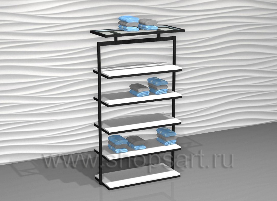 Пристенный торговый стеллаж с полками используется для выкладки одежды, обуви, сумок, аксессуаров и др. Стеллаж пристенный оснащен четырьмя полками, одной полкой-подиумом и одной стеклянной полкой. Благодаря открытой конструкции, стеллаж удобен для выкладки и просмотра товара. Торговый стеллаж имеет в своей основе металлическую сварную квадратную трубу 25х25мм. с покрытием порошковой краской чёрного, матового цвета.Подробнее