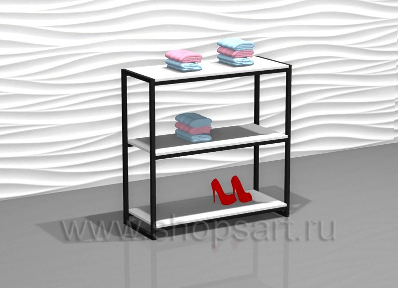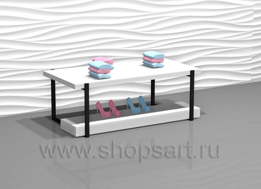 Стол демонстрационный с подиумом и столешницей используется для выкладки товара. Островная группа предназначена для выкладки различного товара: трикотаж, джинсы, аксессуары, в нижней части стола устанавливается подиум для демонстрации обуви. Демонстрационный стол для магазинов имеет в своей основе металлическую сварную квадратную трубу 25х25мм. с покрытием порошковой краской чёрного, матового цвета.Подробнее