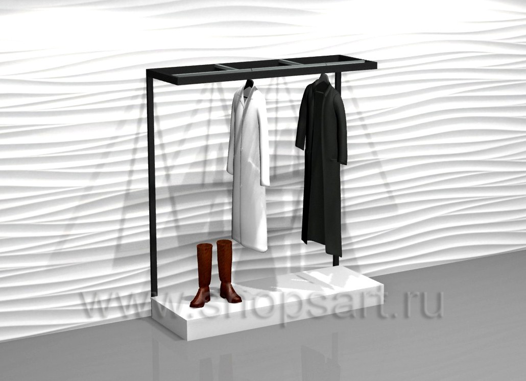 Пристенное вешало используется для вывески женских и мужских пальто, костюмов, платьев. Нижний подиум используется для выкладки обуви и сумок. Благодаря увеличенной высоте вешала, на нём можно вывешивать удлиненные модели одежды. Внизу вешала устанавливается белого цвета подиум из высокоглянцевого МДФ или ЛДСП. Торговое вешало имеет в своей основе металлическую сварную квадратную трубу 25х25мм. с покрытием порошковой краской чёрного, матового цвета.Подробнее
