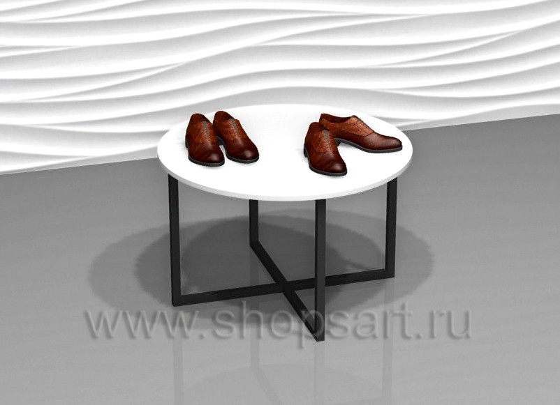 Стол демонстрационный, круглый используется для выкладки товара. Столик небольшой высоты с открытой поверхностью, удобен для демонстрации одежды, обуви, аксессуаров. Островная конструкция может использоваться для презентации новых коллекций. Размещается в торговом зале, но может быть и элементом интерьера и устанавливаться рядом с диваном в зоне ожидания. Демонстрационный столик для магазинов имеет в своей основе металлическую сварную квадратную трубу 25х25мм. с покрытием порошковой краской чёрного, матового цвета.Подробнее