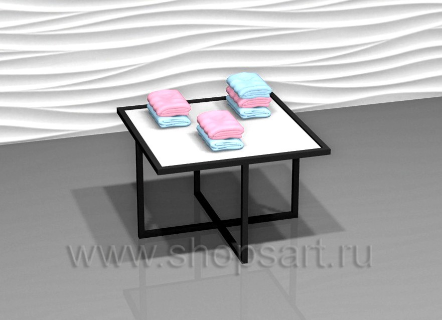 Стол демонстрационный, квадратный используется для выкладки товара. Столик небольшой высоты с открытой поверхностью, удобен для демонстрации одежды, обуви, аксессуаров. Островная конструкция может использоваться для презентации новых коллекций. Размещается в торговом зале, но может быть и элементом интерьера и устанавливаться рядом с диваном в зоне ожидания. Демонстрационный столик для магазинов имеет в своей основе металлическую сварную квадратную трубу 25х25мм. с покрытием порошковой краской чёрного, матового цвета.Подробнее