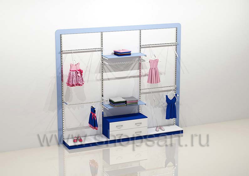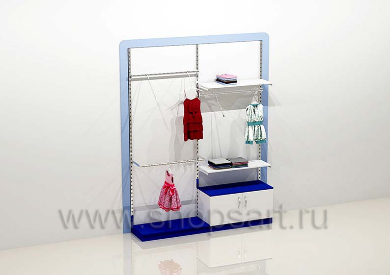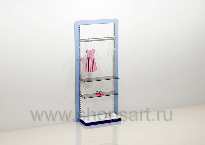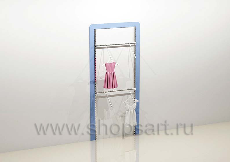 Стеллаж торговый для одежды имеет открытую конструкцию, оснащен навесными фронтальными и наклонными кронштейнами для демонстрации одежды, регулируемыми по высоте. Стеллаж обрамляется декоративной, радиусной рамкой, выполненной из матового, голубого цвета ЛДСП 16 мм. Перфорированные стойки и декоративная рамочка крепятся к стене, а навесные элементы устанавливаются в перфорированную стойку.