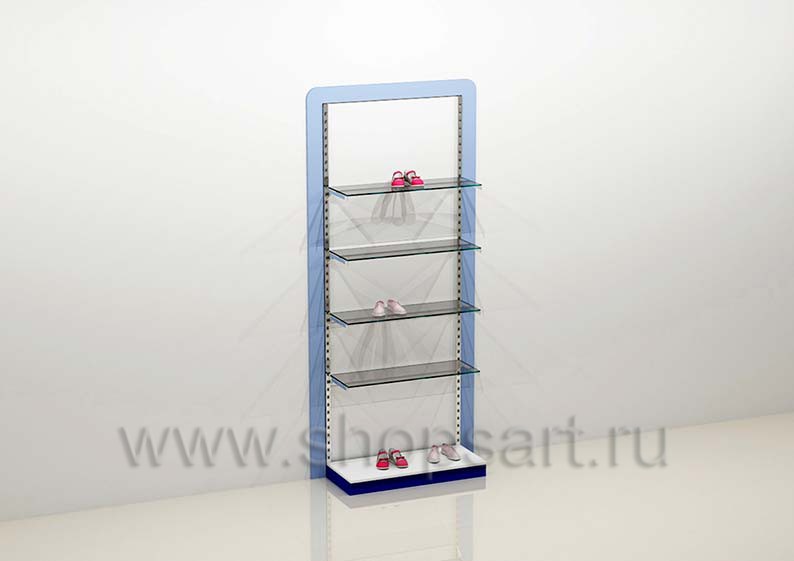 Стеллаж торговый пристенный для выкладки товара имеет открытую конструкцию, предназначен для демонстрации обуви на полочках, выполненных из стекла 8 мм. В нижней части стеллажа устанавливается демонстрационный подиум, выполненный из матового ЛДСП 16 мм на котором можно поместить обувь или представить сумки. Конструкция торгового пристенного стеллажа обрамлена в декоративную, радиусную рамку, выполненную из матового, голубого цвета ЛДСП.