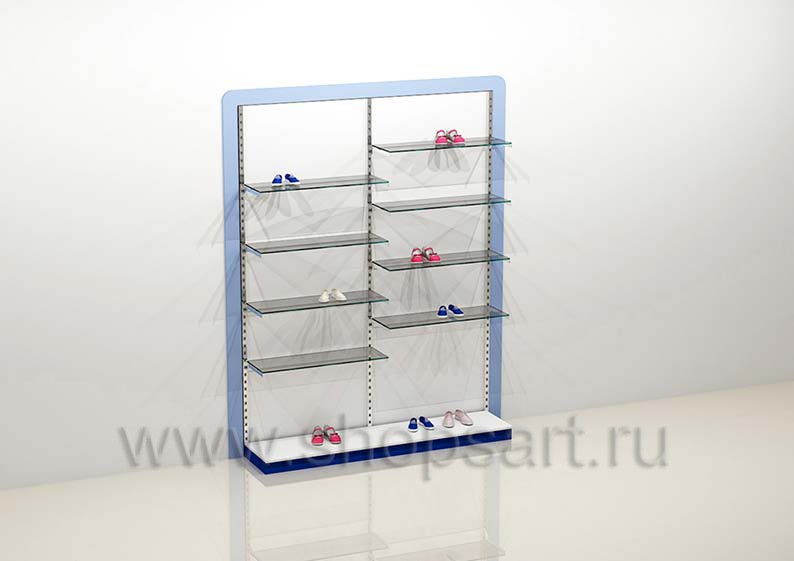 Пристенный стеллаж для товара, имеет две открытые секции со стеклянными полочками, предназначенными для демонстрации обуви, сумок или любых других товаров. Обувь размещается на стеклянных полках, установленных по высоте на разном уровне, что позволяет красиво оформить выкладку товара. Комплектуется полкодержателями, регулируемыми по высоте. В нижней части стеллажей устанавливаются подиумы, выполненные из белого, матового ЛДСП с синим цоколем. Стеллажи обрамлены в декоративную рамку голубого, матового цвета.