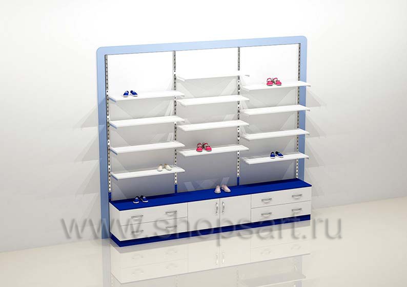 Торговый стеллаж для демонстрации товара с навесными кронштейнами, имеет открытую конструкцию состоящих из двух торговых секций. Для выкладки товара устанавливаются полочки, выполненные из матового ЛДСП 16 мм синего цвета. В нижней части секции блока стеллажей устанавливается накопитель для хранения размерного ряда товара с выдвижными ящиками или распашными дверками. Все навесные элементы устанавливаются в перфорированную стойку и регулируются по высоте.
