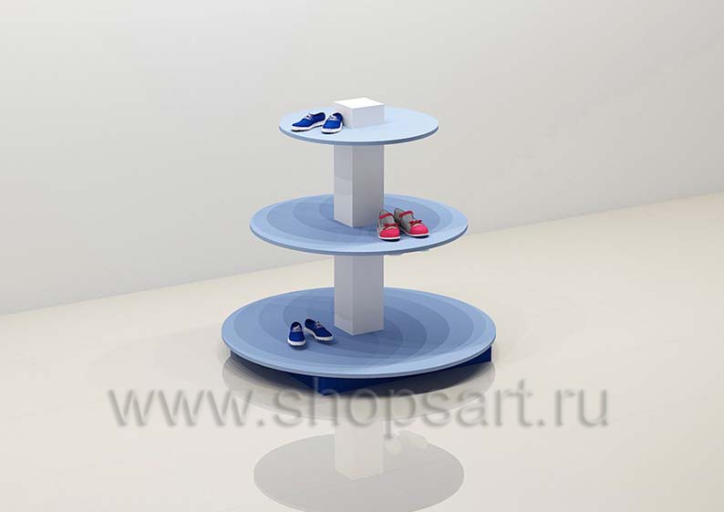 Стойка торговая, островная представлена в виде многоуровневой конструкции с круглыми полочками разного диаметра, служит для выкладки товара или обуви. Предназначена для оформления островных конструкций в центре торгового зала детских магазинов обуви, одежды или аксессуаров. Торговая островная стойка выполнена из белого, синего и голубого матового ЛДСП. Полочки для выкладки товара выполнены из стекла 8 мм.