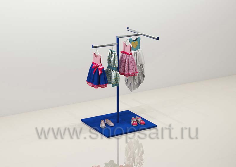 Стойка островная Г-образная используется для демонстрации одежды в торговом зале. В нижней части островной стойки имеется подиум для выкладки обуви или сумок. Эта эксклюзивная островная стойка необычной формы привлечет покупателей к эксклюзивной одежде или новинкам размещенным на ней. Используется в торговом зале или выставочном павильоне. Торговая стойка имеет в своей основе металлическую квадратную трубу 25×25 мм, с покрытием порошковой краской, цвет «Ультрамарин» по карте RAL5002 или любой другой цвет по желанию заказчика.