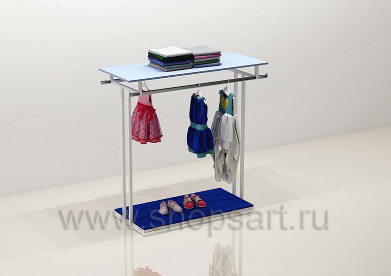 Торговая островная стойка предназначена для демонстрации одежды и обуви в торговом зале, имеет двухстороннюю навеску для одежды и полочку для выкладки размерного ряда товара. В нижней части торговой стойки устанавливается подиум, на котором можно представить обувь или сумки. Каркас торговой островной стойки изготовлен из металлической квадратной трубы 25×25мм. с покрытием порошковой краской белого, матового цвета. Полочка и подиум для выкладки товара выполнены из матового ЛДСП 16 мм голубого и синего цветов.