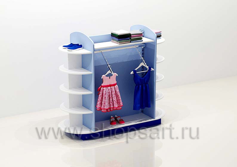 Остров предназначен для демонстрации одежды и обуви в торговом зале. Центральная часть торгового острова состоит из открытых секций, укомплектована навесными кронштейнами и служит для фронтальной демонстрации одежды. Боковые стенки островной стойки состоят из открытых радиусных полочек, на которые можно выставить обувь, выполнены из белого матового ЛДСП 16 мм. Каркас торговой стойки выполнен из матового, голубого цвета ЛДСП. В нижней части торговой стойки устанавливается подиум из синего, матового ЛДСП.