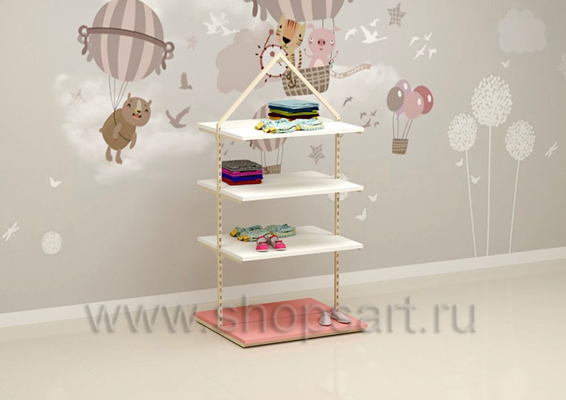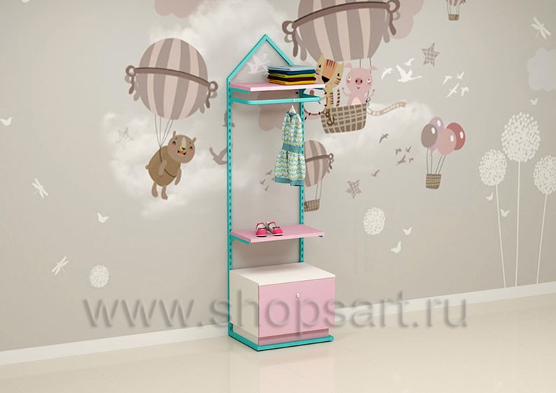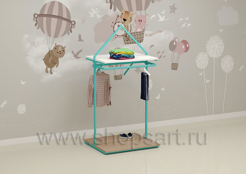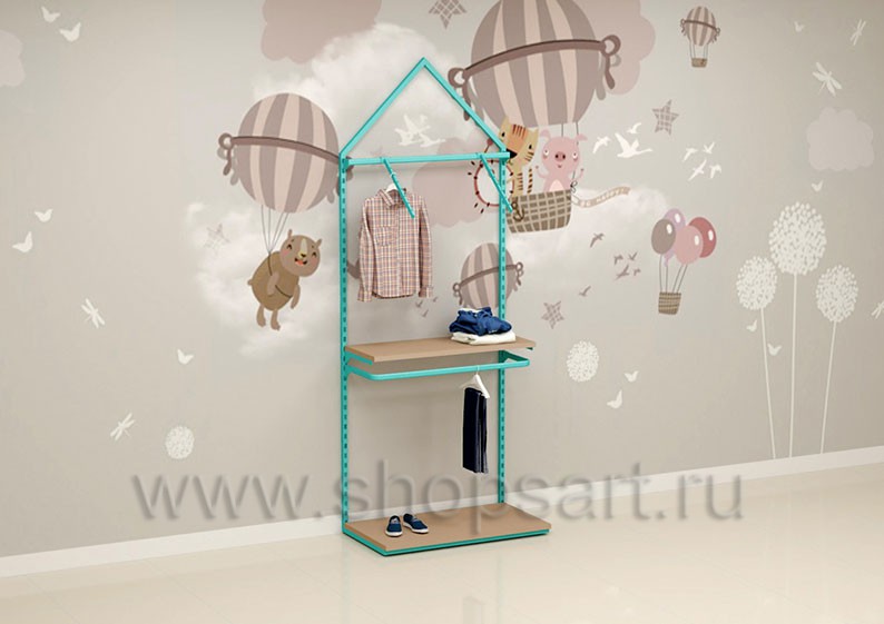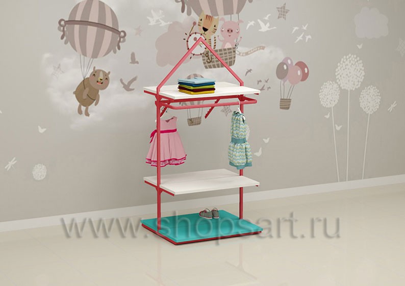 Торговый стеллаж предназначен для демонстрации детской одежды, имеет навеску из «П» образного кронштейна и верхней полочки для выкладки одежды из трикотажа или головных уборов. В нижней части стеллажа устанавливается полочка, на которой можно представить обувь или сумки. Конструкция торгового стеллажа оформлена в виде домика, выполнена из металлической, квадратной трубы с перфорацией.