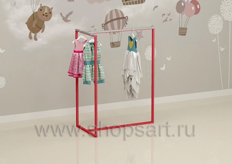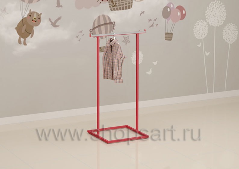 Вешало для детского магазина предназначено для демонстрации одежды. Вешало создано для хорошего обзора товара и удобного доступа к нему покупателей. Вешало компактно, легкое и удобное, подойдет для оформления островных конструкций в центре торгового зала магазина детской одежды небольшой площади. Торговое вешало имеет в своей основе металлическую конструкцию из квадратной трубы 25*25 мм с покрытием порошковой краской цвета «Транспортно красный», RAL 3020. В месте навески одежды монтируется защитная накладка из нержавеющей стали для предохранения стойки от повреждений при эксплуатации.