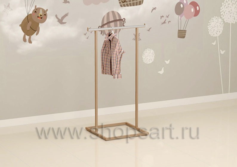 Вешало островное, двустороннее предназначено для демонстрации нарядных платьев или новых коллекций одежды для детей. Устанавливается в центре торгового зала магазина. Изготавливается из квадратной сварной металлической трубы 25х25мм., с покрытием порошковой краской, цвет «Светлая слоновая кость», RAL 1015. В нижней части торгового вешала расположен подиум, на котором можно представить обувь или сумки. В месте навески товара устанавливается защитная накладка из нержавеющей стали для защиты поверхности.