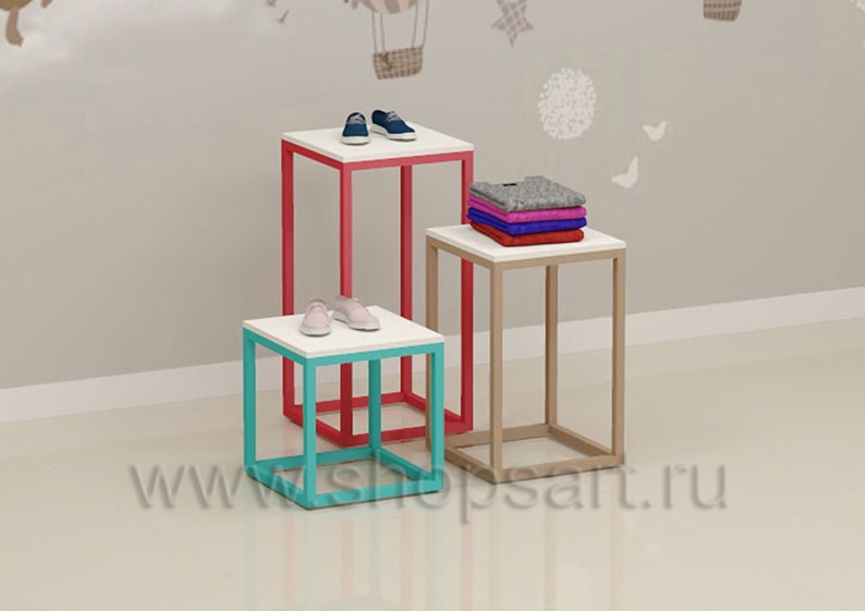 Композиция торгового острова состоит из демонстрационных столиков для выкладки одежды или обуви, подиума и накопителя с выдвижным ящиком для хранения и сортировки товара. Торговый остров предназначен для оформления островных композиций в центре торгового зала магазина или торгового павильона, подойдет для демонстрации новинок или распродаж.