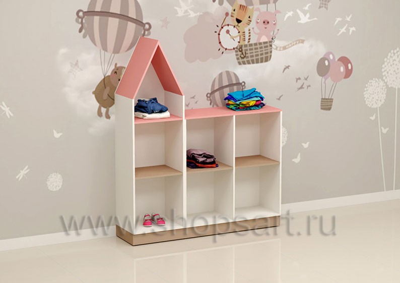 Шкаф торговый состоит из открытых секций с полочками, предназначен для демонстрации детской одежды из трикотажа или обуви. Шкаф для магазина детской одежды выполнен в форме домика. Каркас изделия состоит из комбинированного матового ЛДСП 16 мм белого, розового и бежевого цветов. По желанию заказчика изделие может быть выполнено в любом, другом цвете материалов и габаритных размерах.