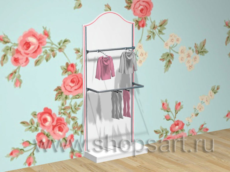 02 CП. Стеллаж для детской одежды с подиумом и двойной навеской.