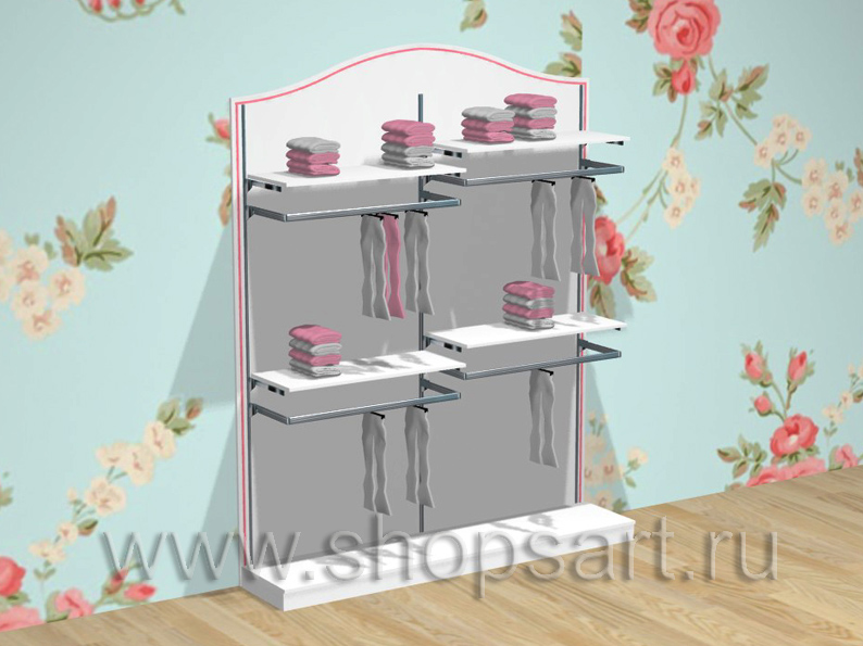 Стеллаж пристенный используется для демонстрации одежды. На перфорированные стойки устанавливаются как различного рода П-образные кронштейны с фронтальными крючками, так и полки стеклянные или из ЛДСП. В нижней части устанавливается подиум для обуви или сумок.
