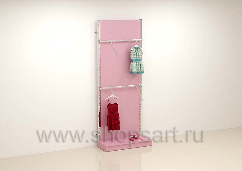 Пристенный стеллаж для демонстрации одежды имеет открытую конструкцию, оснащен навесными фронтальными кронштейнами для одежды. В нижней части стеллажа устанавливается подиум для демонстрации обуви или сумок. Торгово-модульная система состоит из перфорированных стоек, нижних опор и не требует крепления к стене. Навесные элементы устанавливаются в перфорированную стойку и регулируются по высоте. Задняя панель изделия и подиум выполнены из розового, матового ЛДСП 16 мм. Перфорированные стойки и навесные кронштейны выполнены с покрытием порошковой краской белого, матового цвета.