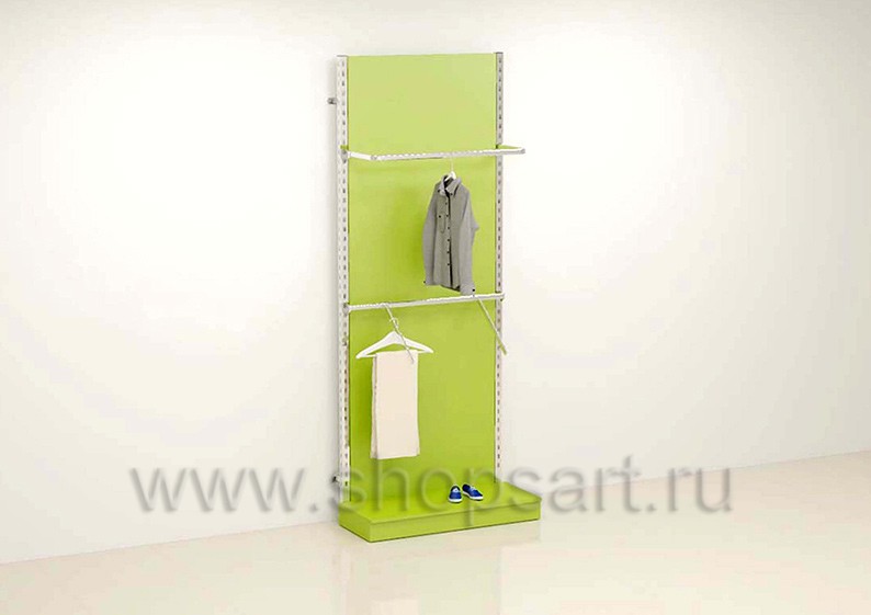Торговый стеллаж предназначен для демонстрации одежды, оснащен навесным фронтальным и «П» образным кронштейном. В нижней части стеллажа устанавливается подиум для демонстрации обуви или сумок. Торгово-модульная система состоит из перфорированных стоек, нижних опор и не требует крепления к стене. Навесные элементы устанавливаются в перфорированную стойку и регулируются по высоте. Задняя панель изделия и подиум выполнены из матового ЛДСП 16 мм, цвет «Зелёный лайм». Стойки и кронштейны выполнены с покрытием порошковой краской белого, матового цвета.