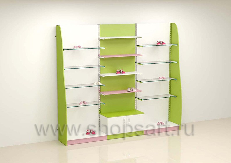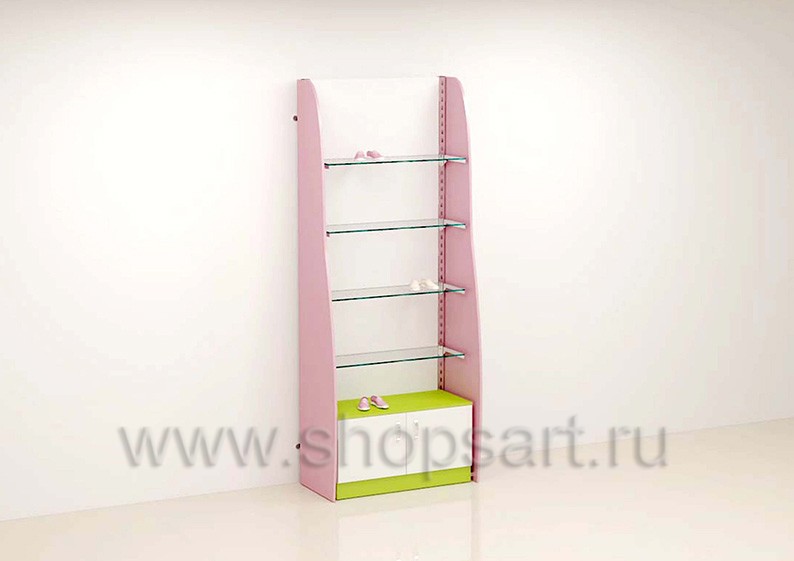 Стеллаж торговый предназначен для демонстрации обуви, сумок или любых других товаров. Товар размещается на полочках, изготовленных из стекла толщиной 8 мм, что позволяет красиво и презентабельно сделать выкладку товара. В нижней части устанавливается накопитель, с распашными дверками выполненный из комбинированного, матового ЛДСП 16 мм для хранения и сортировки товара. Данная модель торгового стеллажа выполнена с фигурными, боковыми стенками из ЛДСП 16 мм матового, розового цвета. По желанию заказчика изделие может быть выполнено в любом, другом цвете материалов.