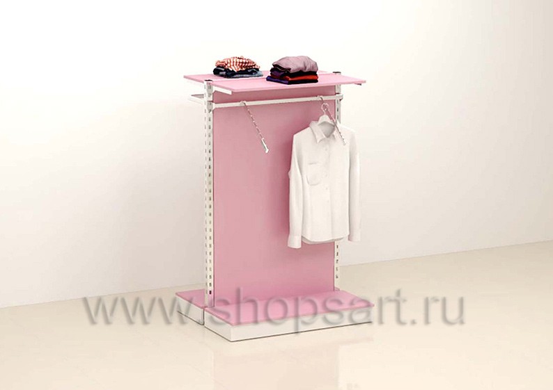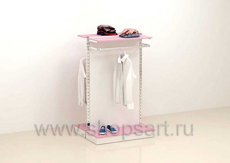 Стойка островная для демонстрации одежды, имеет двухстороннюю конструкцию с навесными кронштейнами для одежды. В конструкции островной торговой стойки установлены перфорированные стойки для установки навесных кронштейнов для демонстрации одежды на плечиках и выкладки товара на полочках. Все навесные элементы взаимозаменяемы и регулируются по высоте. В нижней части торговой стойки устанавливаются подиумы, на которых можно выставить обувь. Изделие выполнено из белого и розового, матового ЛДСП 16 мм. Перфорированные стойки и навесные кронштейны покрыты порошковой краской белого, матового цвета.