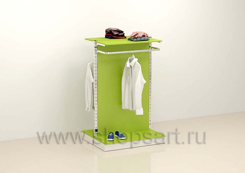 Островная двухсторонняя стойка, предназначена для демонстрации одежды, оснащена навесными «П» образными и фронтальными кронштейнами, и полочками для изделий из трикотажа. В нижней части конструкции торговой стойки установлены демонстрационные подиумы, на которых можно представить обувь Островная торговая стойка выполнена из матового ЛДСП 16 мм белого цвета и цвета «Зелёный лайм». Все навесные кронштейны устанавливаются в перфорированную стойку, взаимозаменяемы и регулируются по высоте.