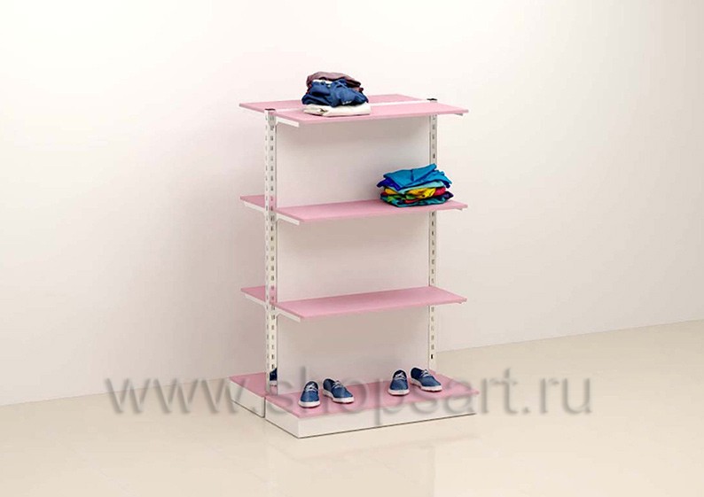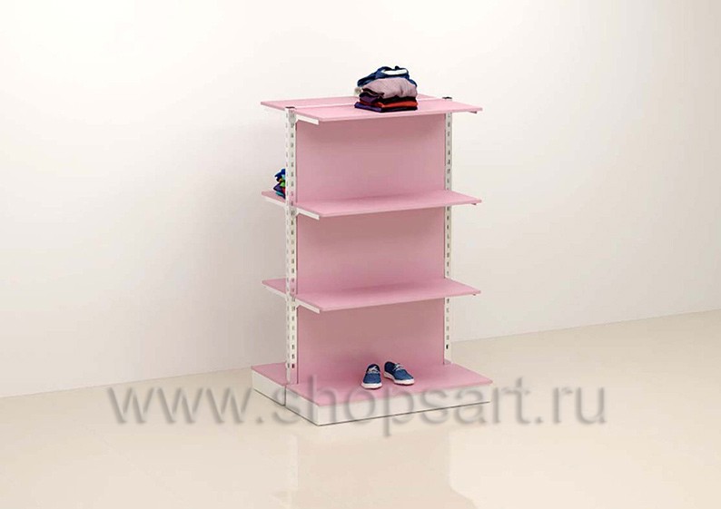 Торговая островная стойка имеет открытую, двухстороннюю конструкцию с полочками для демонстрации обуви или одежды из трикотажа. Все навесные кронштейны устанавливаются в перфорированную стойку и регулируются по высоте. Изделие выполнено из матового ЛДСП 16 мм белого и розового цвета. Перфорированные стойки и навесные кронштейны выполнены с покрытием порошковой краской белого, матового цвета или любого другого, по желанию заказчика.