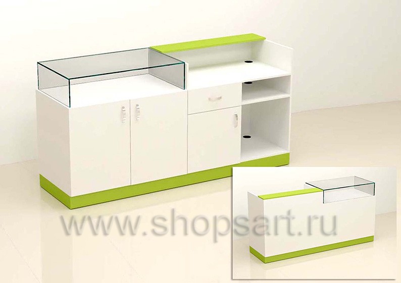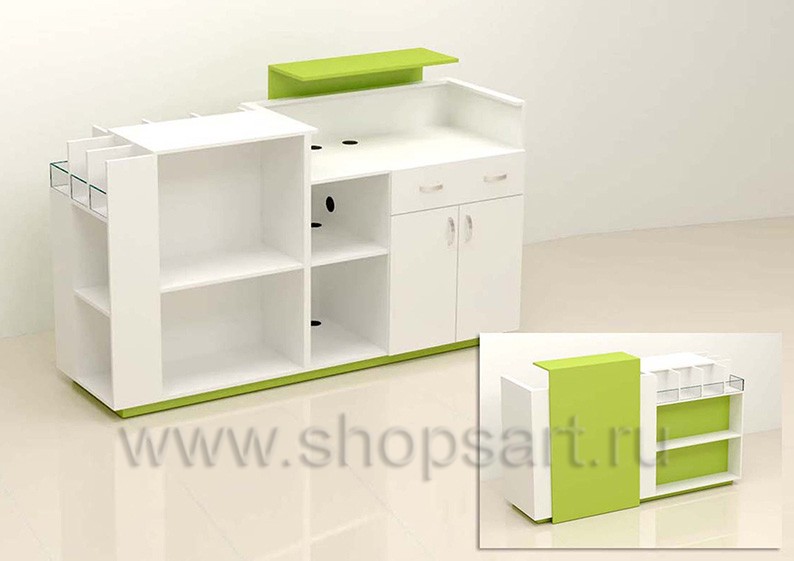 Стол для кассы состоит из рабочего места продавца или кассира и открытого прилавка с полочками и ячейками для сопутствующего товара. Для функционального и эффективного рабочего пространства внутреннее наполнение кассового стола оснащено выдвижным ящиком, тумбой с распашными дверками, открытыми секциями для хранения упаковочного материала и установки системного блока компьютера. Изделие выполнено из матового ЛДСП 16 мм белого цвета и цвета «Зелёный лайм».